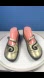 Contrast upper, swirl design, asymmetrical strap with hook-and-loop closure, padded heel cup, silvertone hardware