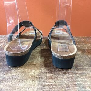 This is a pair of Women’s Naot Marissa Slide Sandals in color Gold Leather. Size EU 38, US 7. Comfort minded slide sandal fitted with a well cushioned, anatomic footbed and arch support with a wedge soul. 1.25 inch heel, 0.75 inch platform. Leather Textile upper, leather lining, synthetic sole. Top strap is stretchy. American podiatric medical association CEO of acceptance. Excellent used condition as seen in picture.