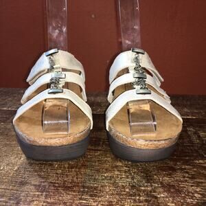 This is a pair of Naot Relate Sandals in color White/Silver. Womens size EU 40, US 9. Leather upper, man made balance. Three straps, Top strap has hook and loop adjustable strap. Middle strap has elastic. Open toe. 3" Heel. 2" platform. Excellent condition as seen in pictures.