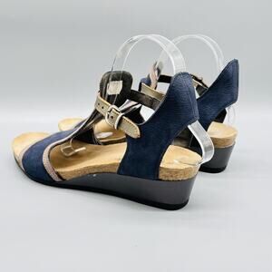 Naot Sandals Womens 9 Blue Leather Fiona Wedge Slingback T Strap Adjustable Cork