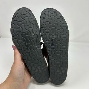 Keywords: Naot sandals, women's strappy sandals, gold leather sandals, cushioned sole sandals, hook & loop closure, wedge heel sandals, low heel sandals, summer casual sandals, pre-owned women's shoes, size 11 sandals, EU size 42 sandals, Israeli made sandals, leather upper sandals, women's summer footwear, comfortable sandals.