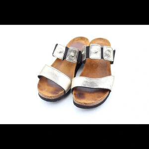 Suede-covered cork and latex footbed for optimal cushioning. Light silver color. Rhinestone details.