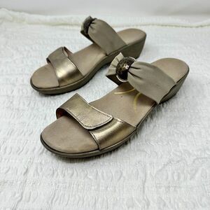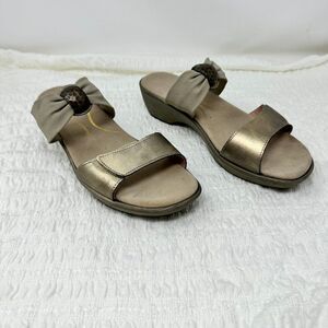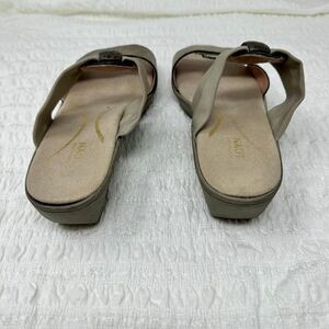 Beautiful sandals from Naot in size 9.5. They have pewter leather adjustable straps across the toe with a fabric strap with a half ring around crossing the midfoot.The insole is very comfortably padded, the rubber soles have minimal wear.