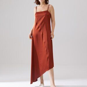 A touch of luxury. A classic slip dress with on-trend elements – double straps, slant cut with a diagonal split-seam down the front. It has a luxuriously sheeny and silken smooth, draping beautifully.