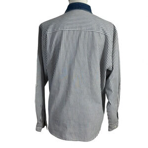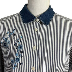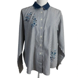 Napa Valley Striped Flower Embroidered Button Up Shirt Denim Collar Petite Large