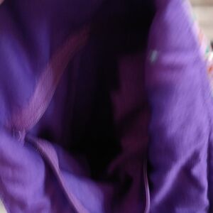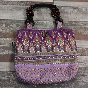 This handbag showcases a captivating blend of purple and pink hues, adorned with intricate geometric and floral patterns. The standout feature is its unique handles, crafted from dark material, adding a touch of elegance to its design.
