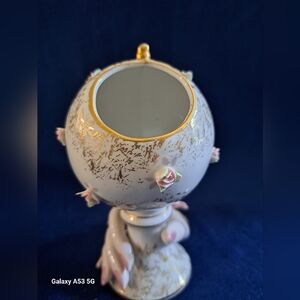 RARE and in mint condition! This is an exquisite and delicate piece of porcelain. Look at all the detaing. The hand, the "ring," the beautiful rose on her wrist and the rosebuds around the globe. All set off with beautiful gold accenting. I've never seen anything similar to this! Approximately 6" tall.
