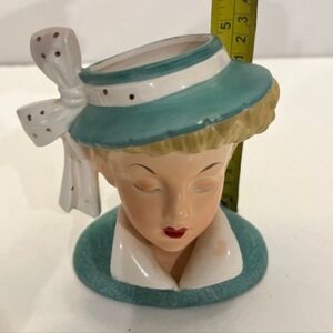 Rare Doll Head Vase with stamp Napco and Date in 50s. This lady is gorgeous with greenish real outfit. no eyelashes. no pearls. my mom gave me her collection. parting now to keep with only one of each color. great to start your own collection💜💜💜