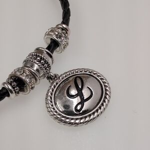 This Napier necklace features a sleek black cord adorned with silver-toned beads and a striking round pendant personalized with L. The elegant contrast of black and silver makes it a versatile accessory for any occasion.
