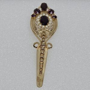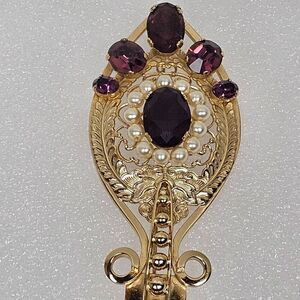 Rare Signed NAPIER on Back (Pre Copyright) Huge Art Deco Era Intricate Detailed Statement Brooch Pin Set With Oval Faceted Prong Set Purple Rhinestones, Faux Pearl Wired Accents, Gold Tone Metal (Possibly Plated Or Filled As Does Not Stick To Magnet)