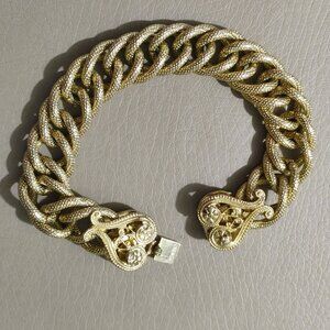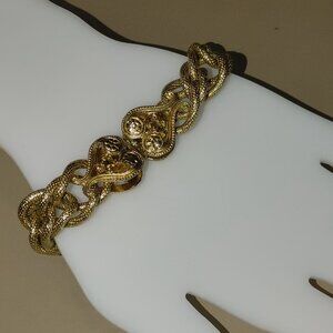 This Napier bracelet showcases the craftsmanship of a bygone era with its gold-tone chain link design and intricate ornate clasp. Its timeless elegance adds a touch of vintage charm to any jewelry collection. Measuring 7 inches, it is a wearable piece of art from the past 1950-1960's.