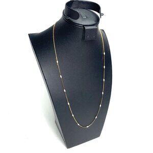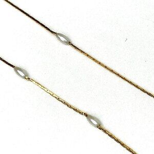 A beautiful, elegant opera length necklace by Napier from the 2000's, featuring a delicate, gold tone, cocoon link chain interspersed with dainty oval shaped, iridescent imitation pearls. Spring ring clasp closure and Napier maker's mark charm at the back of the neck. Excellent preowned condition. See photos of more details.