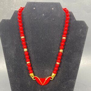 Napier Enamel Pendant Necklace Signed Red Gold Tone Bead Business Classic VTG