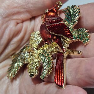 The Napier Gold Tone Red Enamel Clear Rhinestone Cardinal Brooch is a vintage and elegant piece of jewelry that features a gold base metal with red enamel detailing. The main stone color is white/colorless, adding a touch of sparkle to the design. This brooch is perfect for adding a pop of color and sophistication to any outfit, making it a versatile accessory for a variety of occasions.