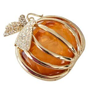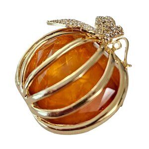 Napier Gold-Tone Caged Orange Resin Pumpkin Rhinestone Leaf Brooch Pin, Signed L98