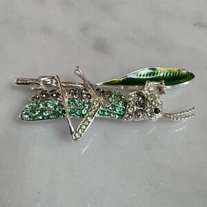 Pre-owned; in excellent condition. No missing stones. No original box. Very clean brooch pin. No signs of wear. A beautiful Napier green grasshopper brooch pin with enamel leaf & green rhinestones which are mounted on silver-tone metal. Clasp pin is in working condition. NAPIER is marked on the underside. This brooch measures 2.5"L x 1"H inch. Measurements are approximate.