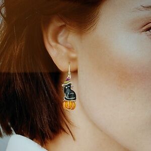 Whimsical earrings featuring black cats with purple hats and orange pumpkins. Ideal for festive occasions.