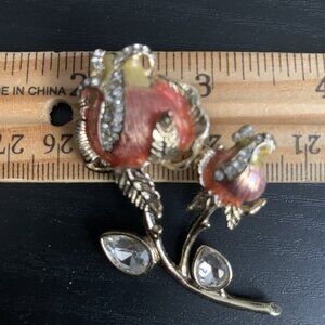Napier Rose Bud Brooch with peach-colored glaze and clear crystals on a gold-tone background. Pin mechanism in perfect working order. Vintage and in excellent pre-owned condition. Hallmarked on the back. D1447