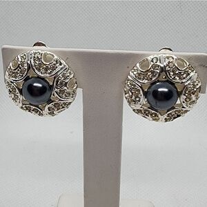 Napier Silver, Rhinestones, & Gray Faux Pearl Clip-On Earrings