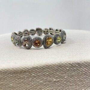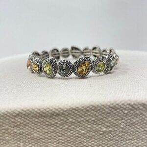 A stylish Napier bracelet featuring teardrop glass stones in various colors, set in a silver-tone stretch design. Suitable for casual or formal wear.