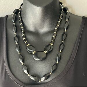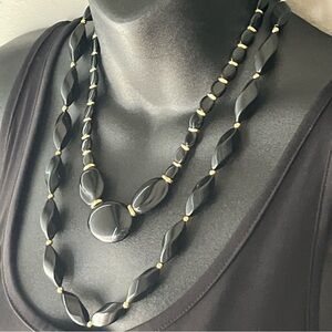 Napier Vintage Black & Gold Beaded Necklaces-18”, 25”- and Clip On Earrings