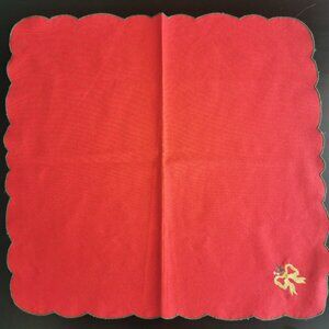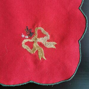 Napkin Red Vintage Embroidered Christmas Green Scalloped Edge Gold Bow COTTON