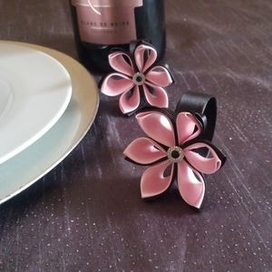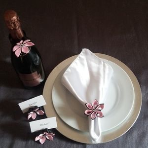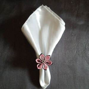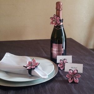 The flowers are made out of double satin ribbon, one petal at a time. Can be used as napkin rings, place card holders and even as bottle dressers :)