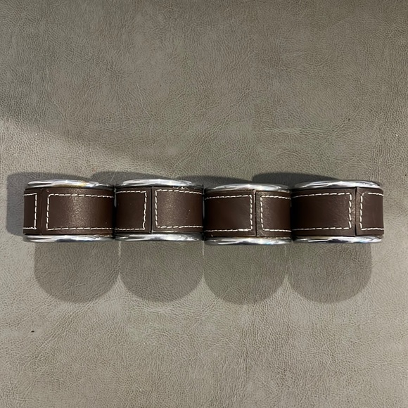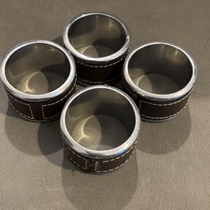 Set of 4 napkin rings- silver color and brown leather ( not sure if imitation or real).