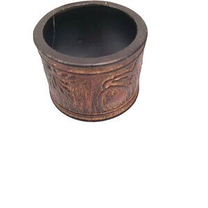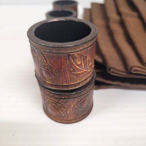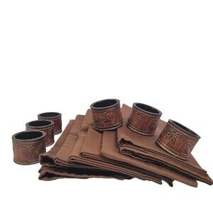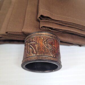 Set of 6 Brown Cloth napkins and set of 6 wood napkin rings/holder with leaves and acorns. One napkin appears to have been washed. The napkins measure approx 17" x 17" and the rings are approx 1 1/4'' wide and 1 1/2" in diameter. They are preowned and very gently used condition.