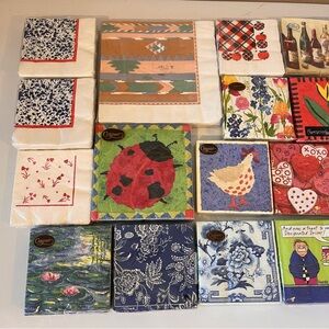 This lot contains 16 sealed + many loose and partial packages of beautiful, colorful paper napkins for your use.