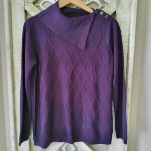 Grab this size small purple long sleeve high drape neck jacquard cable sweater now.