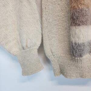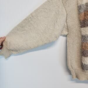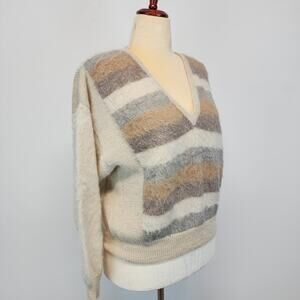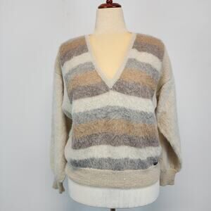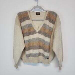 Nar Bolivian Pullover V-neck Sweater Size L Tan Cream Striped Alpaca Wool Fuzzy