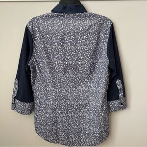 Naracamicie Collared 3/4 Sleeve Button Up Shirt Blue Leaf Print Italy Sz M - in great used condition. When laid flat, top measures approximately 19 inches from pit to pit and 28 inches long. There is no size tag so please carefully review these approximate measurements and compare to another blouse in your closet.
