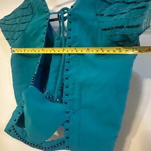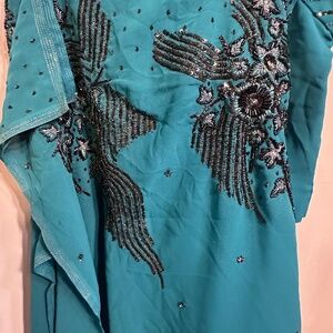 Color is a rich teal/aqua with black and iridescent beadwork. Very lightweight, flowy, and perfect for weddings, festivals, cultural events, or photoshoots.