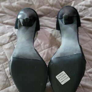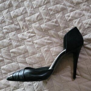narciso rodriguez black leather toe box, black suede heel. Resoled in black. Womens size 7.5/8 4" heel
