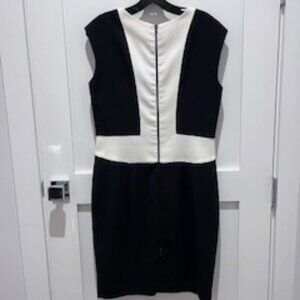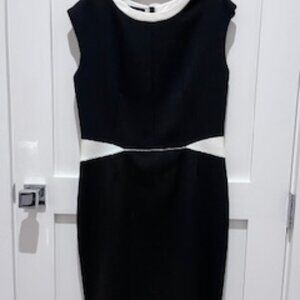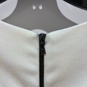 Beautiful Black and White form fitting dress by Narciso. Black dress with white collar and waist details - giving the appearance of smaller waist. Back zipper that runs from top to bottom. The bottom can unzip partial way to reveal a back slit.