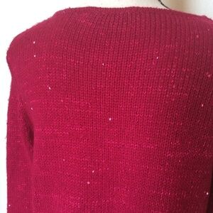 Very cute dark pink knit crewneck sweater with sequins and pink sparkle threading. Fabric is 62% acrylic and 38% polyester. Approximate measurements: Lying flat-bust 20" across from armpit to armpit, sleeve length 25" and length 23". Sweater in excellent pre-owned condition. No pulls, stains or holes.