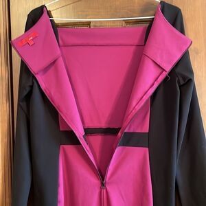 Stunning and flattering, this designer dress in Mulberry and black will receive many compliments. It is well-Tailored and great for work, special events, etc. specific measurements are in photos.