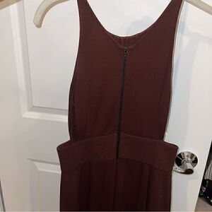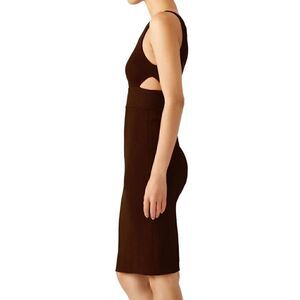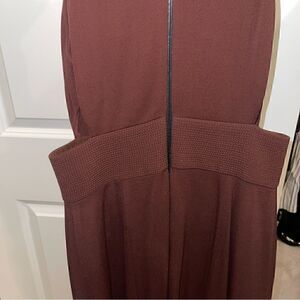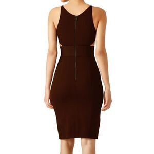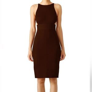 Even sexier in person! In excellent condition. Red crepe (97% Viscose, 3% Elastane). Sleeveless. Crew neckline. Sheath bodice with side cut outs and banded waist details. Exposed back zipper. 41” from shoulder to hemline. Imported. Size IT 38 or US 2