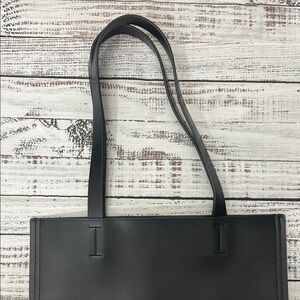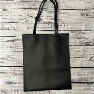 Narciso Rodriguez Parfums Black Faux Leather Tote Bag made of black faux leather and features a minimalist design with handles and a rectangular base. It measures