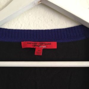 Color block cardigan by Narciso Rodriguez for DesigNation in black, teal, and cobalt. Snap front closure, with a crew neckline, and color block details. Super cute!