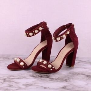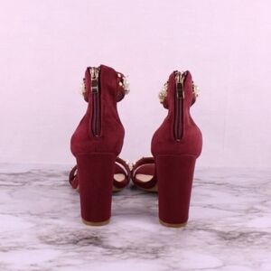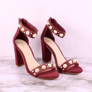 NariuWan, burgundy heels, pearl studded sandals, block heel sandals, ankle strap, open toe, party heels, wedding guest heels, holiday shoes, dressy sandals, pearl embellished heels, burgundy evening shoes, cocktail shoes, women's size 7.5, chic block heels
