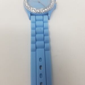This Narmi Gemmed Bezel Blue Strap Women's Watch is in good used condition. It is untested and needs a new battery. The watch has a blue face with large easy to read numbers and has a gemmed bezel. The blue wrist strap is adjustable and has a buckle closure. This trendy blingy watch is easy to clean and perfect for all occasions, formal or casual.