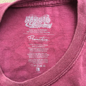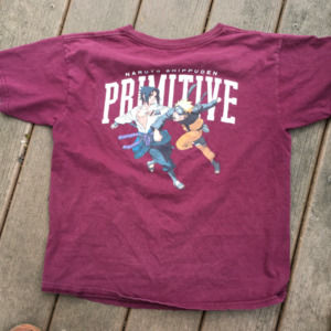 Lovely plum color short sleeve tee shirt. Primitive brand Naruto Shippuden anime design youth large. Washed many times and comfortable. Fun anime graphics on the back. The back is the cover shot for this listing.100 cotton fabric. The larger graphic is on the ba k of this shirt.