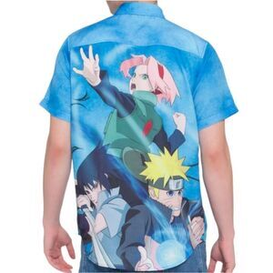 This woven button-up features characters from Naruto Shippuden on the front and back with Japanese text.