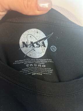 Vintage-style NASA Graphic T-Shirt featuring a unique trippy mushroom and space design. This black short-sleeve tee showcases the iconic NASA meatball logo on the front with a large, colorful psychedelic mushroom and planet graphic on the back. The sleeves also feature matching trippy patterns for a standout look. Large size 2XL for a comfortable or oversized fit.