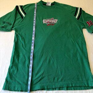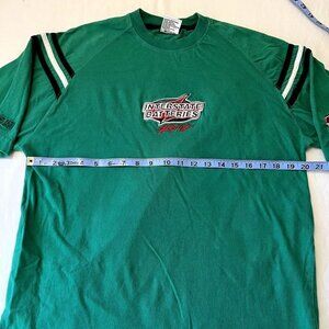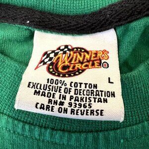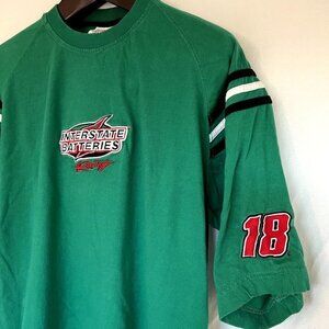 Pre-owned. Front chest stitched/embroidered Interstate Batteries racing logo. Left Sleeve has #18 embroidered and right sleeve has Nascar embroidered. Sleeves feature black and white stripes at shoulder.