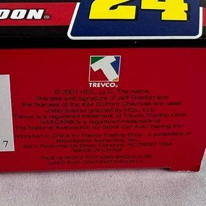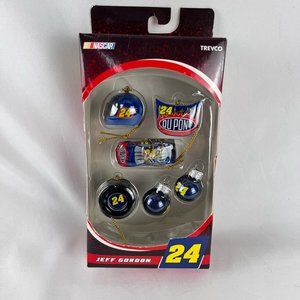 Add a touch of racing fever to your Christmas tree with this Nascar #24 Jeff Gordon Helmet Hood Tire Mini Christmas Ornament 6 Pc Set from 2007. Crafted with resin and plastic materials, these multicolored ornaments are licensed by Nascar and feature a miniature race car shape that measures approximately 1" to 1-3/4" tall. Each ornament depicts the number 24 car driven by Jeff Gordon, and they come with hanging features that make them easy to display. The set includes all three parts of the car and a helmet, hood, and tire, making it the perfect addition to any Nascar fan's holiday decor.