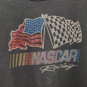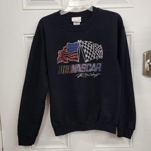 Stylish Nascar sweatshirt. Features American and checkered flags. Comfortable and casual.