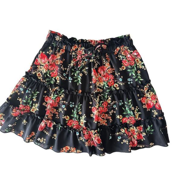 Nashalyly Tiered Floral Skirt Women's M Black Red Lined Boho